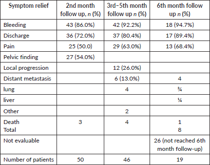 Results: The mean age of the 53 enrolled patients was 56 years (SD, 10.4). Most patients (43 or 81%) had stage IIIB–IVB illness. Of the 50 patients assessed at 2 months, 43 (86%) had a complete response (CR) from vaginal bleeding, 36 (72%) from vaginal discharge and 25 (50%) from pelvic pain. In the 3rd–5th months, 46 patients were assessed; CR rates were 42 (91%), 37 (80%) and 29 (63%) for vaginal bleeding, vaginal discharge and pelvic pain, respectively. In the sixth month, 19 patients were eligible for assessment, and CR rates were 18 (94%), 17 (89%) and 13 (68%), respectively. The most common acute toxicity was fatigue, followed by grade 1 diarrhea. Four patients had grade three bladder complications.