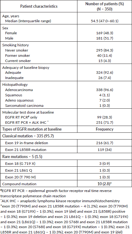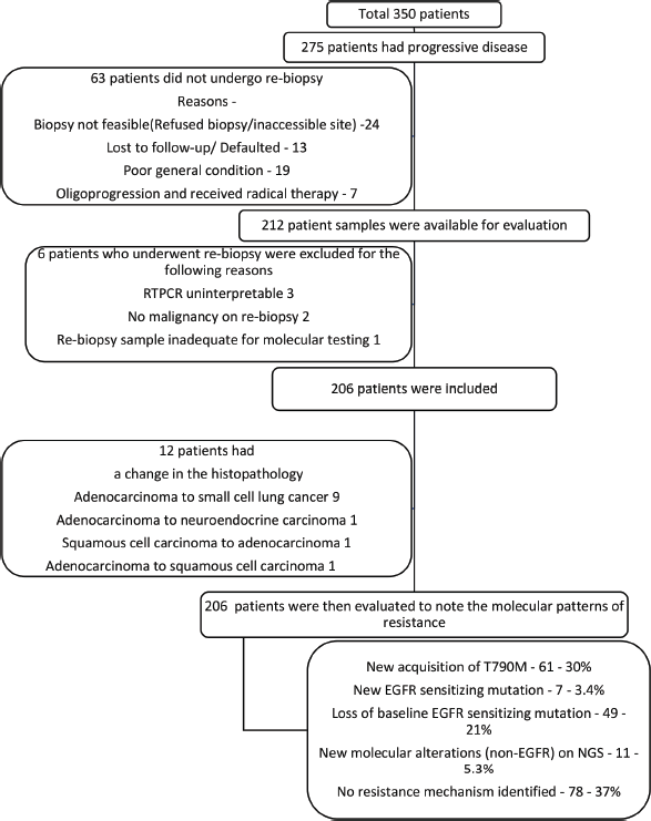 Materials and methods: This post hoc analysis of a Phase III trial conducted at Tata Memorial Centre (TMC) in Mumbai, India, included 350 patients with advanced EGFR-mutant NSCLC. Patients were randomised to receive either gefitinib alone (n = 176) or gefitinib with chemotherapy (pemetrexed and carboplatin, n = 174). The primary objective was to identify resistance mechanisms following progression. Secondary objectives included comparing resistance patterns between the two arms and assessing progression rates and outcomes. At progression, histological and molecular evaluation was done with reverse transcription polymerase chain reaction (RT-PCR), anaplastic lymphoma kinase – immunohistochemistry (ALK IHC) and/or next generation sequencing (NGS) at physician discretion.