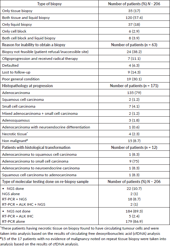 Tissue biopsies were obtained on 157 (57.1%) patients and a cell block in 14 (5.1%). Liquid biopsy was performed in 169 (61.5%) patients. The details of repeat biopsy given in the Table 3.