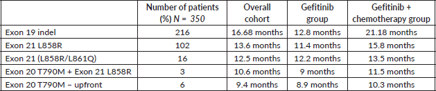 350 patients who were enrolled between August 2016 and 2018 and 176 (50.3%) patients were assigned to gefitinib and 174 (49.7%) patients were assigned to Gefitinib along with pemetrexed and carboplatin. These patients were followed up over the period till May 2024.