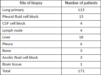 Based on the site of progression and feasibility of biopsy, biopsy or cell block was obtained. The sites of biopsy are charted in Table S4.