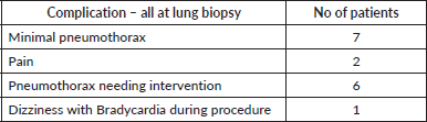 Out of the 115 patients who had lung biopsy, 7 had minimal pneumothorax, 6 needed interventions due to pneumothorax, 1 patient had dizziness and bradycardia and 1 had severe post procedural pain. Of the others only one patient of liver biopsy had significant post procedural pain. The details are tabulated in Table S5.