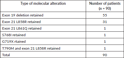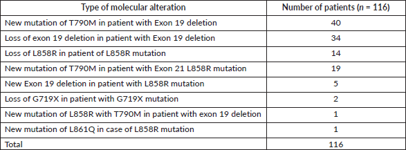 In the molecular analysis, T790M was noted as the predominant molecular alteration noted accounting for 61 patients being 29.6% of the cases with resistance Table S6.