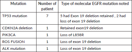 - 2 cases of loss of exon 19 deletion with gain of TP53 mutation