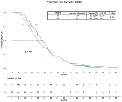 Patients with T790M mutations had a progression-free survival 2 of 22.7 months (95% CI: 19.4–27.4 months), compared to 19.2 months (95% CI: 17.5–22.9 months) in those
