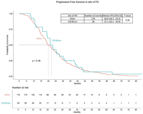 Figure S3. PFS difference between patients progressed in brain or CSF versus other sites of PD.