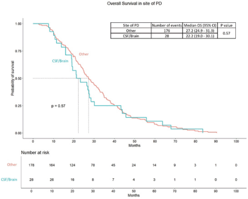 PFS2 among the patients with central nervous system (CNS) progression was 22.1 months (95% CI – 19.1 – 30.9 months), while the PFS 2 in patients progressed at other sites was 20.0 months (95% CI – 18.3 – 23.3 months) (p = 0.38). The OS was 27.2 months (95% CI – 24.9 – 31.3 months) in patients with CNS progression compared to 22.2 months (95% CI – 19.0 – 30.1 months) in the patients progressed other sites (p – 0.57). The survival curves are provided in Supplementary Data Figures 3 and 4.