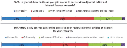 Recognizing the importance of access to published findings highlighted in the earlier report, respondents were asked first how easily they could gain access to peer-reviewed journal articles of interest to their research. A quarter experienced some difficulties or could rarely access the articles they needed. The cancer researchers’ experience was similar to that of the Biological Science respondents to the SOAP survey (29%).
