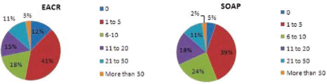 When respondents were asked how many peer-reviewed research articles they had published in the last five years (Open Access and not Open Access), 41% (39% SOAP) had had 1–5 articles published but there were also 33% (42%) with 6–20 articles published and 13% (13%) had published more than 20 articles; 12% (5%) of respondents had not published in the last five years.