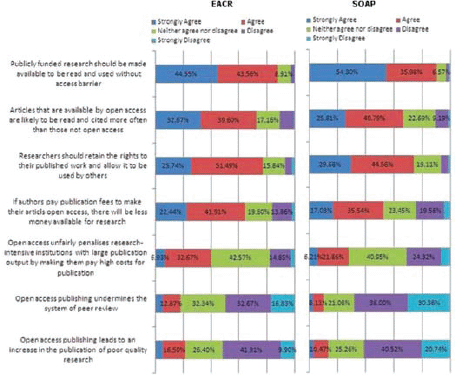 While the survey had not focussed on Open Access specifically, comment banks and discussions at consensus meetings following the publication of the survey results highlighted the issue of access to subscription journals, the barrier to essential and urgent information that a ‘paywall’ creates, and the need for free access. Recognising this issue to be an important one EACR completed a second survey picking up on the issue of Open Access publishing in March 2011. This paper publishes the results of that survey, which was again conducted across the European membership of EACR, and cross references responses with selected data from the Study of Open Access Publishing (SOAP) 2011 [2] which was undertaken across all academic disciplines. The SOAP data are freely accessible and can be mined for information by anyone who wishes to. A number of questions were included in the survey that mirrored those used by SOAP, allowing the direct comparison of results. In this article, a comparison has been made between the responses provided by cancer researchers to the EACR survey and the 7,433 respondents to the SOAP survey from the Biological Sciences. (Over 43,000 responses were received across all disciplines to the SOAP survey.)