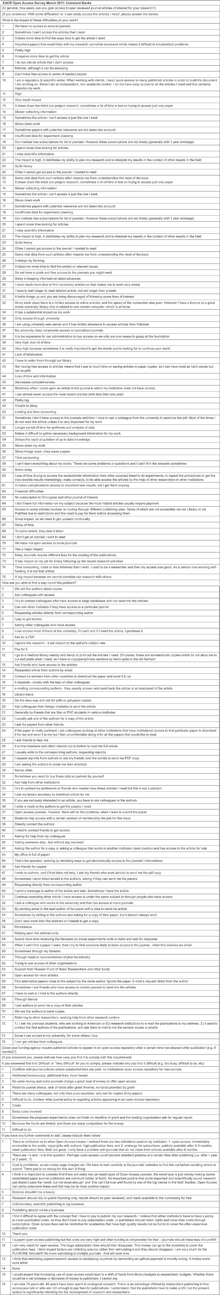 The comment banks also revealed that research is being hindered by a lack of access to the articles that are required and that valuable time is spent on attempts, sometimes futile, to find what is needed. Comments show that some solutions could be found informally but required resourcefulness, persistence and placed great reliance on informal international networks of friends and colleagues.
