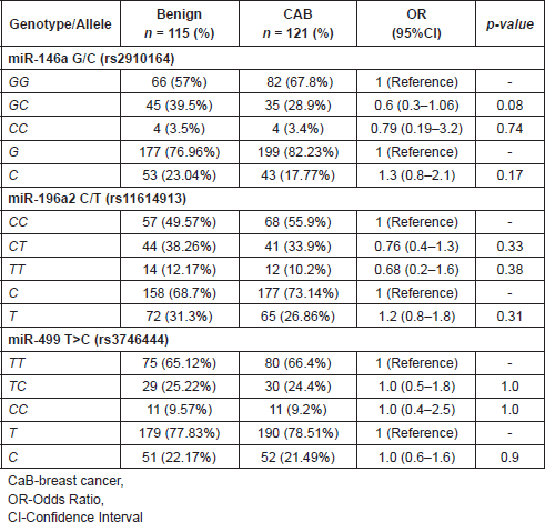 So, this present case control association study was designed to evaluate the role of pre-miRNA genetic variations miR-196a2 C/T (rs11614913), miR-146a G/C (rs2910164) and miR-499 T>C (rs3746444) polymorphisms in susceptibility to breast cancer.