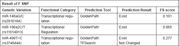 An In silico analysis using FSNP showed a change in transcriptional regulation by miR-146a G/C (rs2910164), miR-196a2 C/T (rs11614913) and miR-499 T>C (rs3746444) variations (Functional score 0.101, 0.065 and 0.277, respectively).