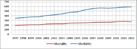 Figure 1. Morbidity and mortality caused by cancer per 100,000 population, Lithuania.