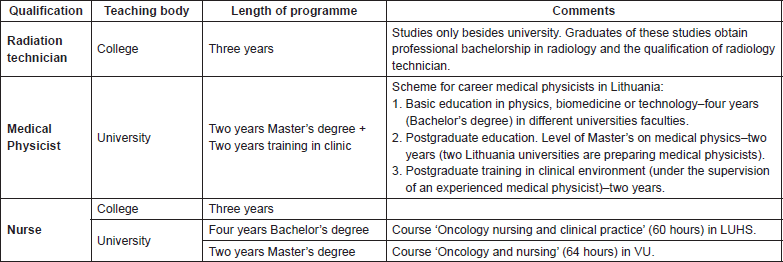In the universities of Lithuania, there are Bachelor studies (four years) for nursing and public health specialists, Master’s studies (two years) for medical biologists, medical geneticists, medical physicists, nurses, public health and rehabilitation specialists who will encounter oncological patients at their job. In these study programmes, only nurses and medical biologists have oncology as a separate course. Education of the related specialities in oncology is shown in Table 2.