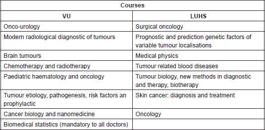 Oncology in the programmes of medicine is integrated into the teaching courses. As a separate oncology, the only mandatory subject in LUHS is ‘Haematology and Oncology’ (in the fourth year). In VU the mandatory subject is ‘Basics of Clinical Oncology and Cancer Biology’ (in the third year), and an elective subject—‘Cancer prevention’. According to the MOSES report, the teaching of oncology for undergraduate students is foreseen in 85% of the countries, but that of medical oncology in only 50% [7].