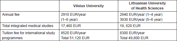 Two Universities in Lithuania are the sites for education and training in medicine: Vilnius University (VU) and Lithuanian University of Health Sciences (LUHS). In Lithuania, only integrated (combining the Bachelor’s and Master’s degrees) studies of medicine are carried out. The course takes six years, including a one-year internship. Up until 2008–2009, graduates of medicine faculties gained their clinical experience separately, that is, during the period of internship organised according to the principles of residency. Since 2009–2010, after the legal basis in the Republic of Lithuania was altered, internship has become a part of the programme of integrated studies of medicine. It is now as a module of clinical medical practice (internship).