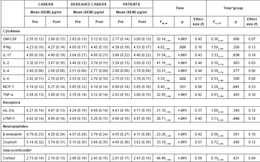 Overall, across all three groups, the results showed a significant decrease in cortisol and neuropeptide levels accompanied by an acute increase in cytokine and receptor activity (GM-CSF, IL17, IL2, IL4, TNFα, sIL-2rα and sTNFr1) suggestive of a general activation of the cytokine network. However, IFNγ and IL6 did not fall below the adjusted significance value of p < .002, and there was also no significant change over time for MCP1.