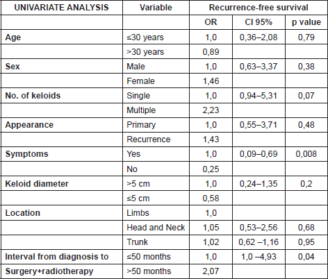 Results: Around103 keloids were analysed in 63 patients treated with 15 Gy in three fraction radiotherapy which was initiated on the same day as the surgery (75% of cases). The median keloid diameter was 6 cm; the most common site was thoracic (22%); the most common cause was prior surgery (35%); 37% caused symptoms, and several (47%) had received prior treatment with corticosteroids (32%), or surgery (30%). The median follow-up was three years, and 94% of recurrences occurred during the first year following treatment. Uni and multivariate analyses showed that an absence of symptoms was a protective factor for recurrence (OR: 0.24), while the time interval from onset to treatment with surgery plus radiotherapy >4.2 years was a risk factor (OR: 2.23). The first year recurrence rate was 32% and stabilised at 32% by the second year with no recurrences after 15 months.