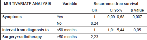 The statistical analysis was performed using the SPSS programme version 19.0 to calculate the rate of recurrence using Kaplan-Meier tracking measurement curves, and possible protective or risk factors were identified through the logistic regression (Odds Ratio) model.