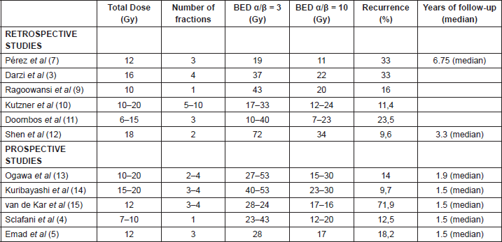 If we analyse the results of the prospective series, these seem to support the findings of the previous studies that the higher the total dose of adjuvant radiotherapy, the lower the rates of recurrence and vice versa. For example, the work of Ogawa [13] showed a recurrence rate of 29.3% using 15 Gy, which could be reduced to 14% when a larger total dose of 20 Gy was administered to certain lesions. Another study which supports the results obtained by Ogawa is that of Kuribayashi et al [14], who achieved a recurrence rate of 9.7% with brachytherapy using a total dose of up to 20 Gy. The opposite was shown in the series by van de Kar et al [15], who used a small total dose of 12 Gy and achieved a high recurrence rate (71.9%).
