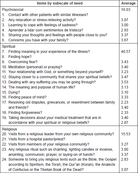 Comparing the original data of the development and validation of the questionnaire in the English language [9], the data of the cultural adjustment to the Mandarin language [15], and those of this cultural adjustment, the Brazilian spiritual need seems to be greater than the others, with higher average scores in the three subscales respectively: psychosocial 12.1, 13.7, and 16.03, spiritual 30.1, 28.5, and 40.57, and religious 9.5, 8.3, and 15.53 [9, 15]. The reliability assessment between our study and those mentioned above was similar. The internal consistency assessment with the Cronbach alpha coefficient for the validation studies in English, Mandarin, and Portuguese was respectively, 0.95, 0.89, and 0.9 [9, 15].