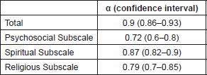 The Cronbach alpha coefficient was 0.9, with the corresponding calculations for the psychosocial, spiritual, and religious subscales: 0.72, 0.87, and 0.79 (Table 4).