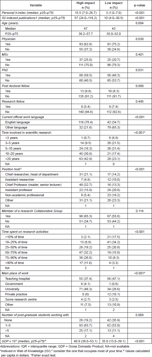 Researchers who publish in high-impact journals were older than their low-impact counterparts (p = 0.004). However, not only age but also time in academia was different because researchers who published in high-impact journals have longer time periods devoted to research (p<0.001). Moreover, researchers who published in high-impact journals more frequently lived in countries that were considered wealthier (p = <0.001) and whose official language was English (p<0.001) (Table 1).