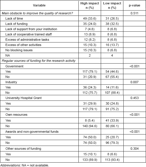 Results: A total of 269 questionnaires were analysed. The researchers shared some common perceptions; both groups reported that they were seeking recognition (or to be leaders in their areas) rather than financial remuneration. Furthermore, both groups identified time and funding constraints as the main obstacles to their scientific activities. The amount of time that was spent on research activities, having >5 graduate students under supervision, never using text editing services prior to the publication of articles, and living in a developed and English-speaking country were the independent variables that were associated with their article getting a greater chance of publishing in a high-impact journal. In contrast, using one’s own resources to perform studies decreased the chance of publishing in high-impact journals.