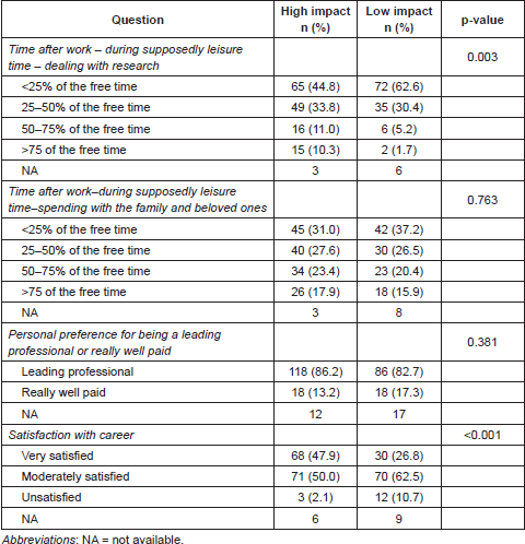 When questioned regarding their preference between being very well financially compensated or being considered leaders in their areas, the majority of the participants declared that they would prefer to be a leader (204 of 240, 85%), with no apparent difference between the groups. Notwithstanding, the researchers who published in high-impact journals significantly considered themselves more satisfied with their present work situation than the researchers who published in low-impact journals (p<0.001) (Table 3).