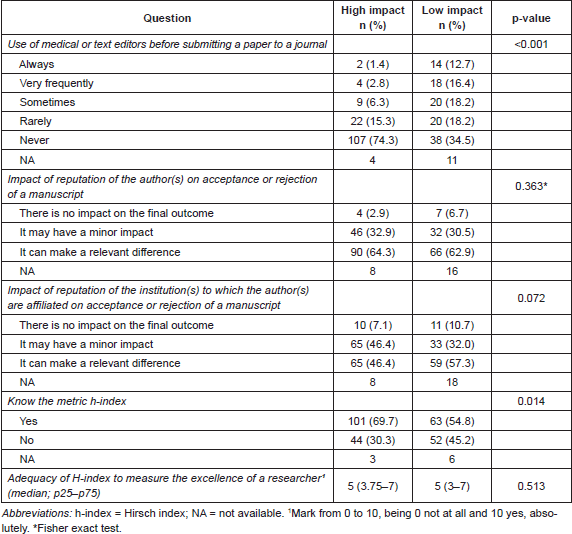 The majority of the researchers who published in high-impact journals stated that they rarely or never used text editing services prior to submitting their manuscripts for publication; in contrast, the researchers who published in low-impact journals used these services with greater frequency (p<0.001) (Table 4).