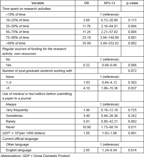 Having more than five graduate students under supervision (OR = 4.1), never using text editing services prior to the publication of articles (OR = 10.90), and living in a country whose official language is English (OR = 2.85) that has a higher per capita gross domestic product (OR = 1.05) were the independent variables that were associated with a greater chance of being published in a high-impact journal. However, living in a country that has a higher per capita gross domestic product had a borderline relevance. In contrast, using one’s own resources to perform studies was an independent variable that decreased the chance of publishing in a high-impact journal (OR = 0.22) (Table 5).