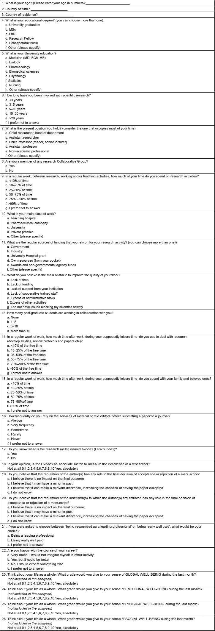 The final questionnaire in English (Table S1) was transposed in full to SurveyMonkey (https://pt.surveymonkey.com/) using the editing tools of the programme. The pilot test was performed by emailing the questionnaire in English to eight researchers who speak English fluently (North American, n = 2; Portuguese, n = 1; Brazilian, n = 5) so that they could clarify any possible difficulties that may be encountered in completing the questionnaire.