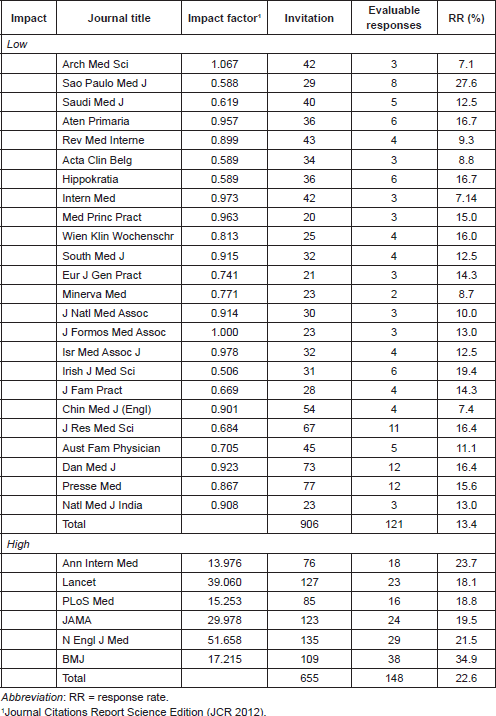 The journals in the category of ‘Medicine, General & Internal’, as classified by the Journal Citations Report (JCR) Science Edition 2012 (ISI Web of Knowledge), were selected for this study. In this category, 151 journals were identified with a median IF of 1.067 from which two groups of general medicine journals were selected, namely the journals with a high scientific IF and the journals with a low scientific IF. The high-IF journals were defined as having extremely high (outliers) IFs that ranged between 13.976 and 51.568. The journals with IFs between the 25th and 50th percentiles (IF=0.50–1.067) were considered to be low-IF journals. Initially, the authors noted that some low-IF journals annually published few original articles, but later it was estimated that each journal would sum up to 30–35 articles that could also potentially be evaluated. Thus, considering a total sample of 780 invitations that could be sent to the researchers from the group of low-IF journals, the authors randomly selected 24 journals out of 39.