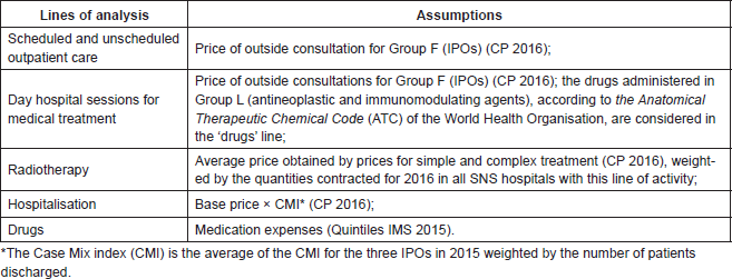 All of the costs associated with the treatment of cancer in a hospital environment are identified, quantified, and assessed, dividing them into the following types of activity: treatment and complementary diagnostic exams prescribed through primary care; scheduled and unscheduled outpatient care, day hospital visits for medical treatment, radiotherapy, hospitalisations, and medications (chemotherapy/immunotherapy/hormone therapy) in a hospital environment.