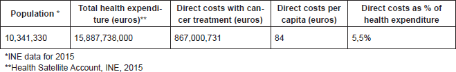Table 3 shows that the annual cost of cancer treatment in Portugal amounted to 867 million euros, representing 5.5% of the total health expenditure and 84 euros per capita.