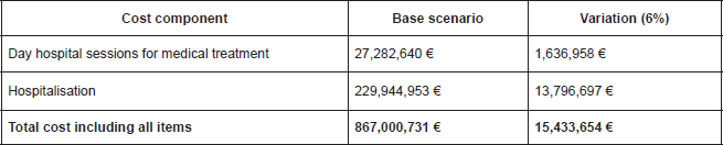 Lastly, given that the unit costs used are those of public hospitals, a sensitivity analysis was carried out in this field. A variation of between −10% and +10% in unit costs results in a respective variation of between −6% (−56 thousands euros) and +6% (+56 thousands euros) in the total cost of the treatment.