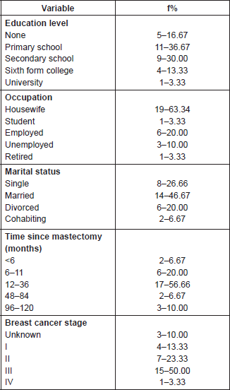 The sample consisted of 30 women studied at the State Cancer Institute. Most of the women were married housewives with a primary school education, were 12–36 months post-mastectomy, and had stage III breast cancer at diagnosis (Table 1).