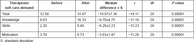 The therapeutic self-care demands were classified by total score, knowledge score, skills score and motivation score. Patient therapeutic self-care demand scores were statistically significant when comparing the median of the differences (before and after the nursing intervention) (P = 0.0001) (Table 2).