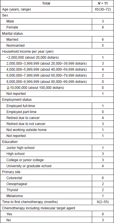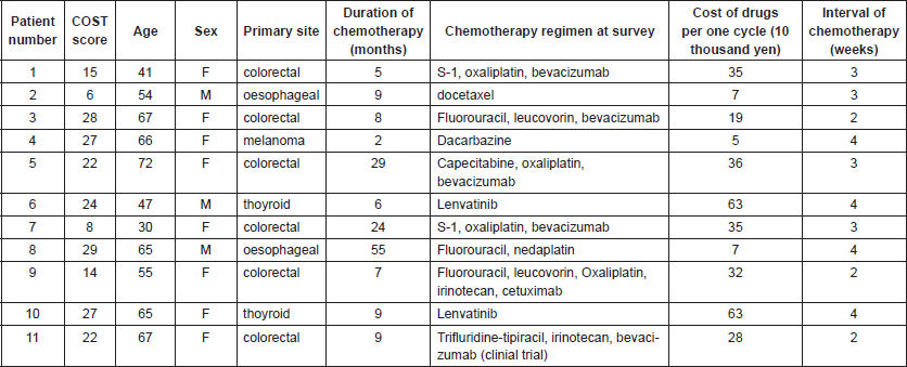 Patients were recruited between January and February 2017. Of the 12 patients approached, 11 (92%) responded to the questionnaire. Patients’ characteristics are listed in Tables 1 and 2. Median age was 65 (range 30–72) and 8 (73%) patients were female. Primary tumour sites were colorectal (n = 6: 55%), oesophageal (n = 2: 18%), thyroid (n = 2: 18%) and melanoma (n = 1: 9%). Eight patients (73%) received treatment with at least one molecular targeted agent, including bevacizumab, cetuximab and lenvatinib. The median length of time from the start of chemotherapy was 9 months (range, 2–55 months).