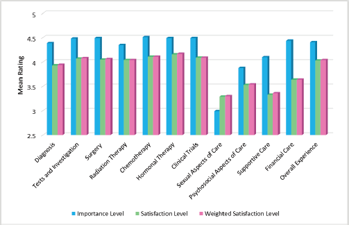 The responses also indicate that respondents were generally satisfied with the information provided, especially those that are related to treatments. In order of satisfaction (based on mean weighted satisfaction scores), patients were most satisfied with the information received on hormonal therapy (4.17), chemotherapy (4.11) and clinical trials (4.09). However, there are aspects of information that need to be addressed more efficiently and effectively. This is reflected in the mean weighted satisfaction scores of the following aspects of care based from the lowest scores: 1) sexual aspects of care (3.3), 2) supportive care (3.36), 3) psychosocial aspect of care (3.54) and 4) financial care (3.64).