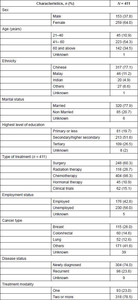 Table 1 describes the self-reported demographics, diagnosis and treatment modalities of the patient sample. The fairly educated sample consisted of Chinese, Malay and Indian and other races with Chinese making up the majority. The top three forms of cancers in Singapore (colorectal, breast and lung) are represented in the sample. Twenty-three percent (n = 93) had received one treatment modality and 77% (n = 318) received two or more treatment modalities.