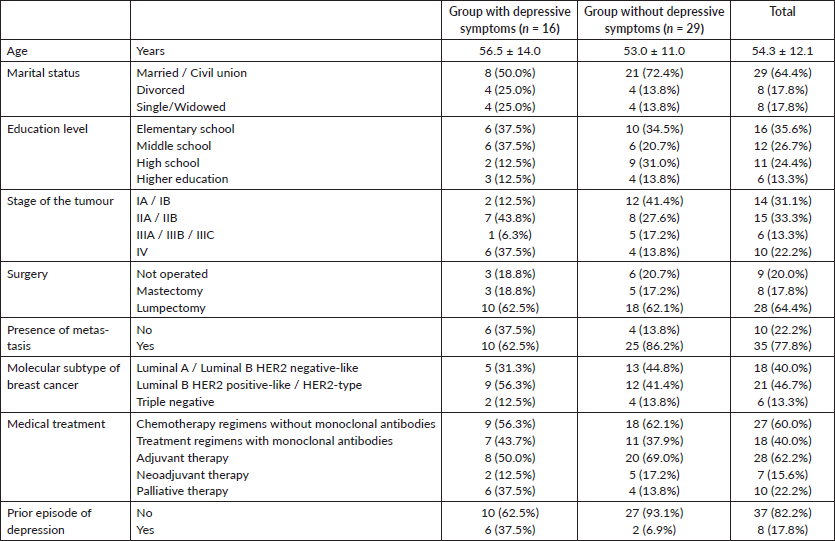 Results: We included 45 female patients. Sixteen (35.6%) patients had a positive HADS-D questionnaire and depressive symptoms confirmed by a psychiatric physician. Of those patients, 7 (15.6%) had a major depressive episode confirmed by psychiatric interview. There was a significant association of depressive symptoms with the future perspectives scale (p = 0.022), breast symptoms scale (p = 0.011) and arm symptom scale (p = 0.005). Significant differences were found in the fatigue (p = 0.024), pain (p = 0.037) and dyspnea (p = 0.009) subscales being worse in patients with depressive symptoms. The association between having depressive symptoms or not was shown to be significant or marginally significant for the variables stage of the tumour (p = 0.057), presence of distant metastasis (p = 0.072) and previous diagnosis of depression (p = 0.011). The patients treated with regimens containing monoclonal antibodies presented better outcomes in various subscales of the EORTC QLQ-C30 and QLQ-B23 questionnaires than those patients treated with chemotherapy regimens without monoclonal antibodies.