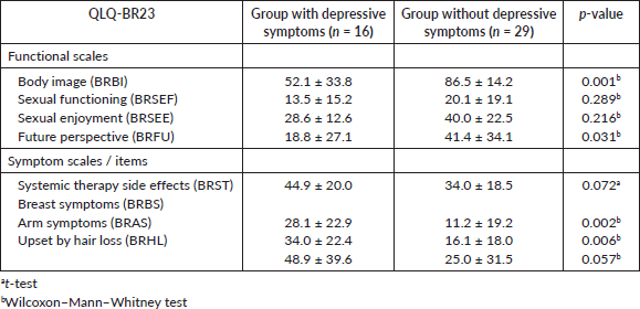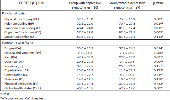 Table 2. Mean values ± standard deviation of the EORTC QLQ-C30 subscales for the group of patients with depressive symptoms and the group of patients without depressive symptoms and p-values.