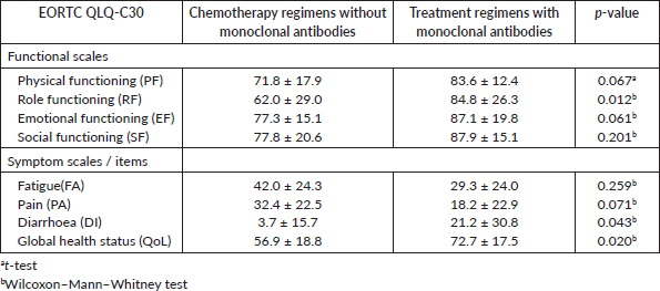 Table 8. Mean ± standard deviation of EORTC subscales QLQ-C30 for the group of patients treated with chemotherapy regimens without monoclonal antibodies and patients performing treatment regimens with monoclonal antibodies and p-values, both groups without depression.