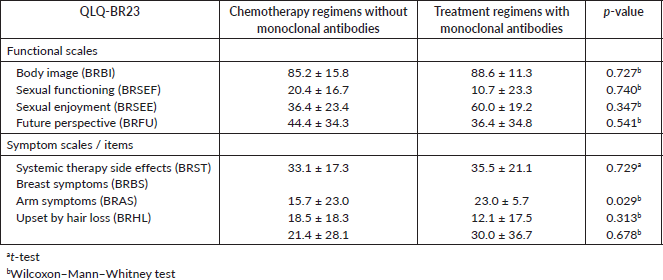 Table 9. Mean ± standard deviation of EORTC subscales QLQ-BR23 for the group of patients treated with chemotherapy regimens without monoclonal antibodies and patients performing treatment regimens with monoclonal antibodies and p-values, both groups without depression.