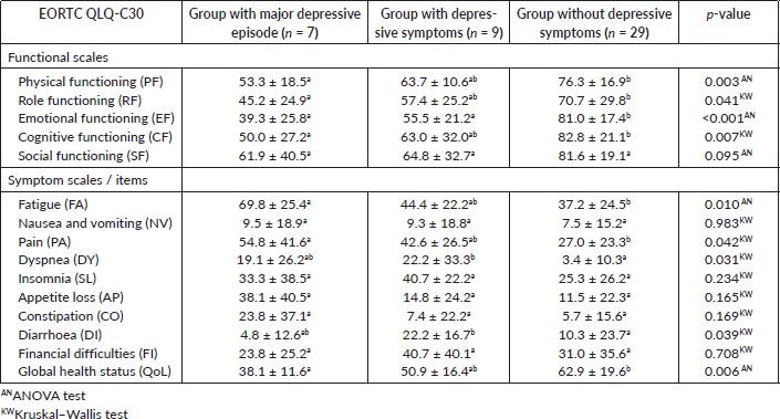 Table 1. Mean values ± standard deviation of the EORTC QLQ-C30 subscales for the group of patients with major depressive episode, group of patients with depressive symptoms and group of patients without depressive symptoms and p-values. Subscript with non-common letters means that the difference between the two groups is statistically significant.