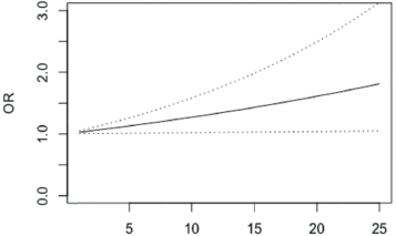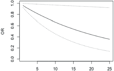 Figure 5. OR of not having depression in patients with differences in BRAS scale scores between 1 and 25 points (95% confidence bands for the OR are shown in dash lines).