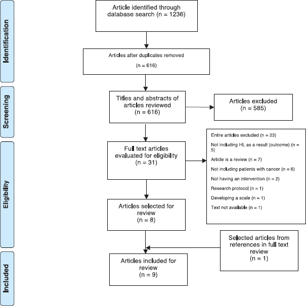 1,236 results were retrieved. Duplicates were eliminated, resulting in 616 articles that were reviewed in title and abstract. From this phase, articles for full reading were selected, of which one article was excluded due to the unavailability of the original article. In addition, in this phase of exploratory screening, one additional article from a systematic review that met the inclusion criteria was included. Thirty-one articles were selected for full-text reading for further evaluation. Of these, 23 articles were discarded, either for not reporting HL in their results (N = 5) for corresponding to a literature review (N = 7), for being articles whose studies do not include subjects with cancer (N = 6) or do not include an intervention (N = 2), for corresponding to a research protocol (N = 1) and finally, for reporting the development of a scale and not a intervention (N = 1). Finally, a total of nine articles corresponding to eight studies (one study published preliminary and final results, both were included) met the inclusion criteria were included in the review. The selection process of the articles is shown in Figure 1.