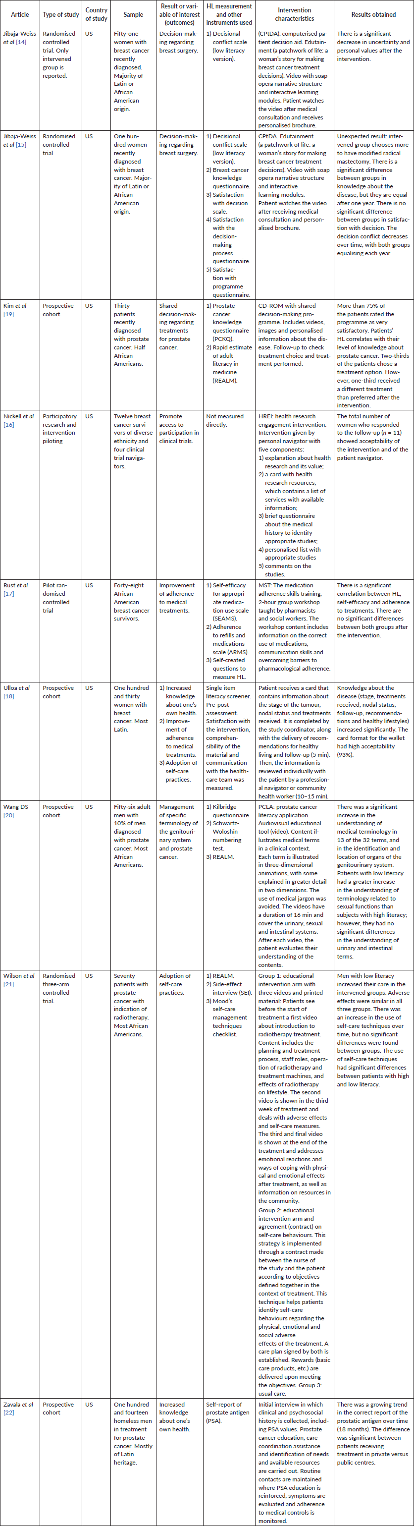 Materials and methods: A literature review was performed using the ‘(health literacy OR Cancer Literacy) AND Cancer AND Intervention’ strategy on seven multidisciplinary databases. Studies that intervened in subjects diagnosed with cancer and treating HL explicitly as a variable to be measured were included.